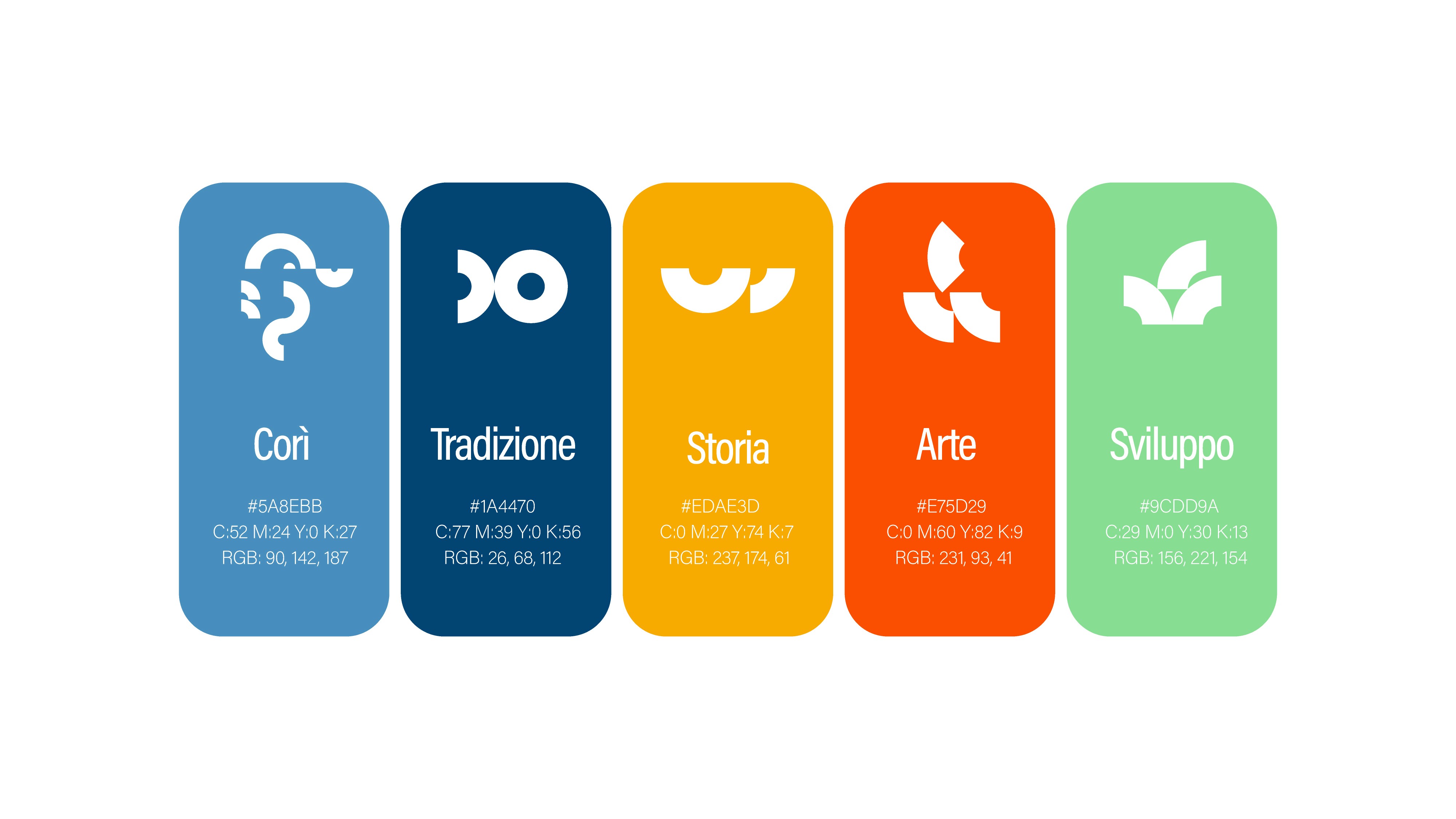 I valori della città vengono tradotti in quattro simboli chiave, ciascuno associato a un colore e a un ambito identitario preciso:
