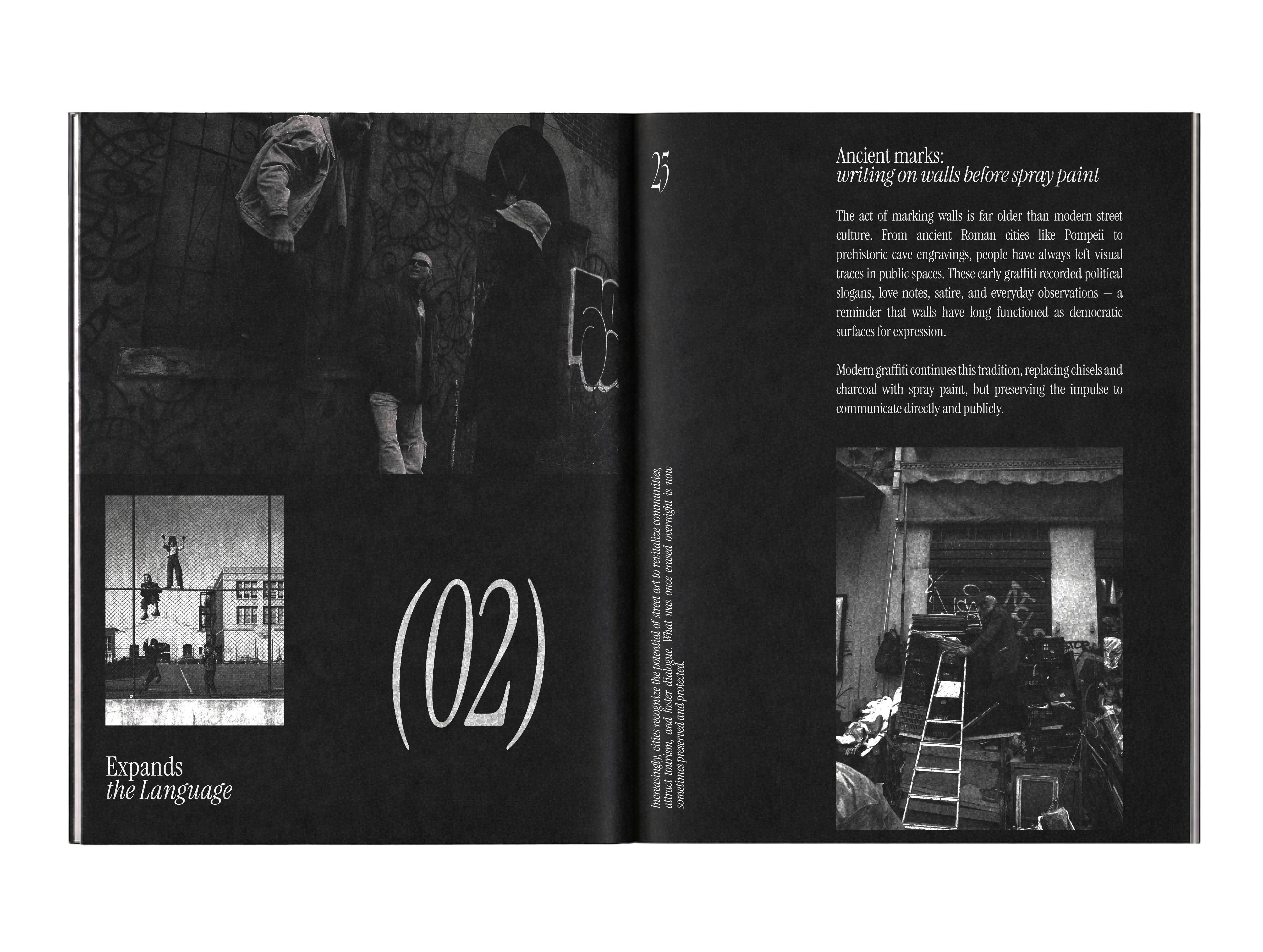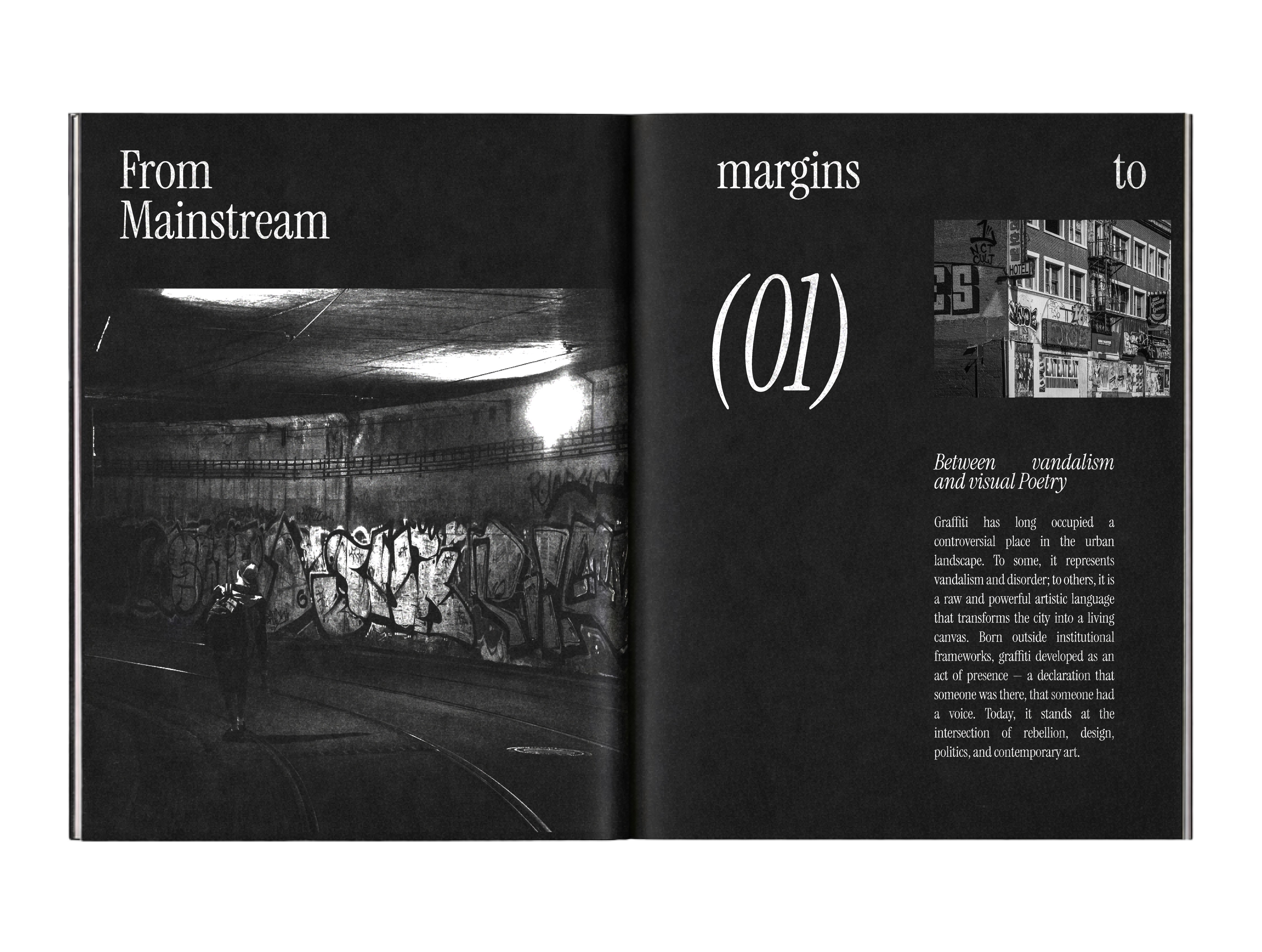 Il progetto riflette sul passaggio dalla strada allo spazio istituzionale, traducendo l’energia spontanea del writing in un oggetto editoriale coerente e dinamico.